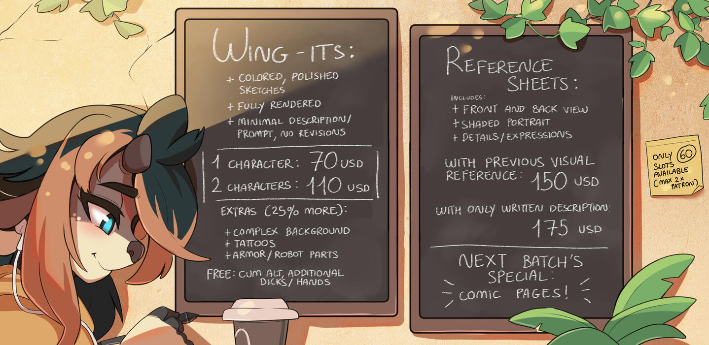 Commissions are ONLY available through Patreon. Join now to be notified of commission openings and get access to discounts up to 75%!Commission types change every batch, so make sure to contact me if you're unsure whether I'll be able to draw your idea!